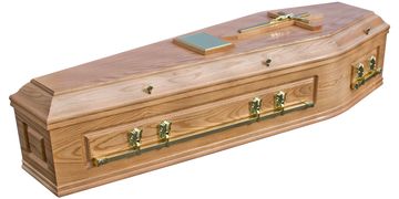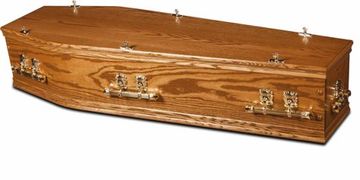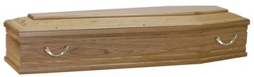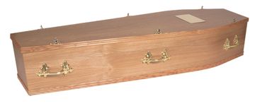 A warm pine coloured oak veneer coffin with wooden handles
