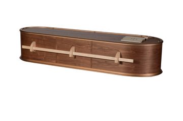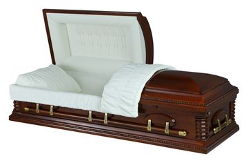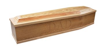 A wonderful solid oak casket with a shaded satin finish. Featuring a decorative oak leaf motif set inside the casket lid. Finished with matching bar handles and a tan crepe interior, this casket is superb in every detail.