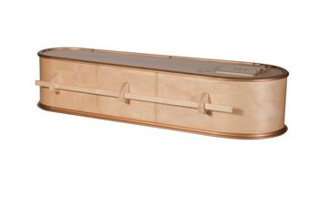 A light oak coloured oak veneer coffin with Yorkcrem handles and single beading