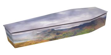 An oak veneer coffin wrapped in a picture from our range. Bespoke pictures can be added at an additional charge.
