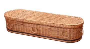 A buff or white coloured wicker coffin with rounded ends and coloured bow options
