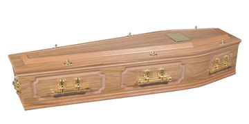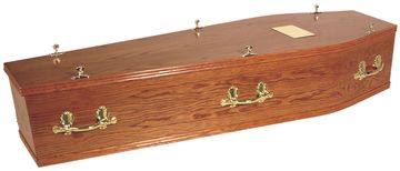 A light mahogany coloured oak veneer coffin with Yorkcrem handles and single beading